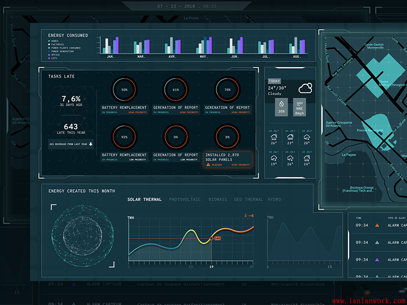 大屏可視化界面設(shè)計(jì)可謂是當(dāng)今行業(yè)、企業(yè)發(fā)展的見證,生動(dòng)直觀地再現(xiàn)了行業(yè)、企業(yè)的全貌。不僅作為展示,方便了解、監(jiān)督;同時(shí)可以作為一個(gè)有效的管理平臺(tái),帶來效益。大屏界面面向范圍廣,協(xié)同性好,易于被采用。下面幾個(gè)大屏的界面設(shè)計(jì),沉穩(wěn)的背景上,加上亮色作為點(diǎn)綴和強(qiáng)調(diào)。既不失其風(fēng)格,又富有靈動(dòng)性。