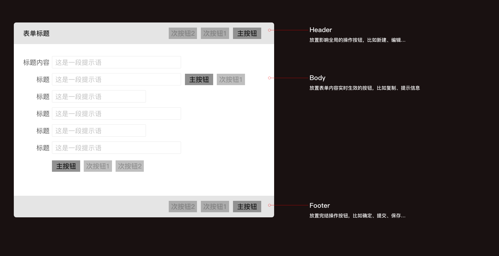 表單中比較常見的按鈕大概有“保存”、“提交”、“取消”、“關閉”、“暫存”、“下一步”、“上一步”...由于B端產品業務邏輯較復雜通常頁面中會有很多操作按鈕,為了更快捷準確的操作,就需要對按鈕按照重要程度分為主按鈕,次級按鈕;為了達到這樣的目的僅僅依靠按鈕樣式還遠遠不夠,還得根據視覺動線給出合理的排列順序。關于按鈕順序,最常見的疑問是主按鈕應該在次級按鈕左邊還是右邊,這里建議使用基于Ant Design 的設計原則,將規范定為:左對齊從左往右閱讀,右對齊從右往左閱讀;