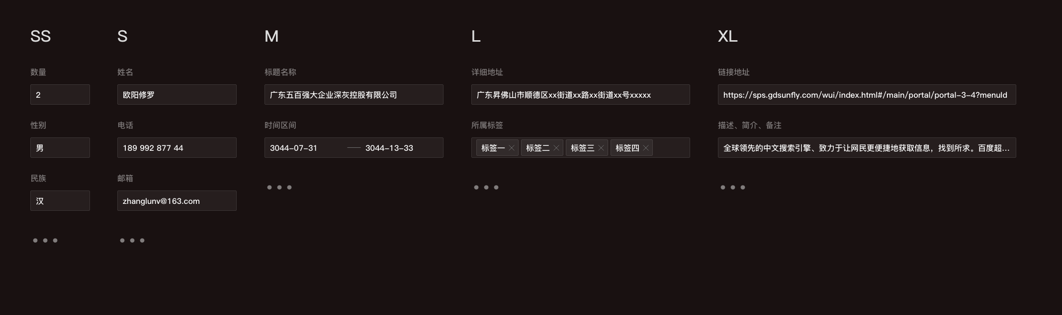 超短(XS):用于短數字、超短文本 短(S):適用于較短文本輸入,如個人信息(姓名、電話、郵箱等) 標準(M):默認輸入框長度,適用大多數情況 長(L):適用較長文本輸入,如網頁地址、標簽組等 超長(XL):適用超長文本輸入如正文(描述信息、備注、摘要、介紹、備注)、超長鏈接等選擇合適的輸入框寬度可以對使用者產生一定的心理暗示從而來減輕使用者的心理負擔,因為在看到字段標題時,心理都會產生對所填信息的預期,大概我要填寫什么,如果選用的輸入框寬度不合適一方面會對使用者造成一定的填寫負擔,同時還會對用戶產生一定程度的誤導。比如:填寫戶籍所在地時,如果輸入框給的太寬就會疑惑,到底應該寫“xx省xx市”、還是應該填到具體“省-市-區-街道-xx號”呢?當遇到更復雜的場景和混排輸入框的情況,為了讓頁面呈現的內容更加有序、整齊,可參照山歌系統的定義方式來定義5種梯度寬度,從而方便設計執行和技術開發。比如定義為 A=超短(XS)的寬度;短(S)的寬度=2A+n;以此類推