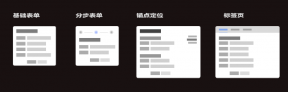表單在設計時需要對其進行合理的歸納簡化,降低表單填寫負荷。 通常我們將表單分為基礎表單、分步表單、錨點定位、標簽頁這幾類。