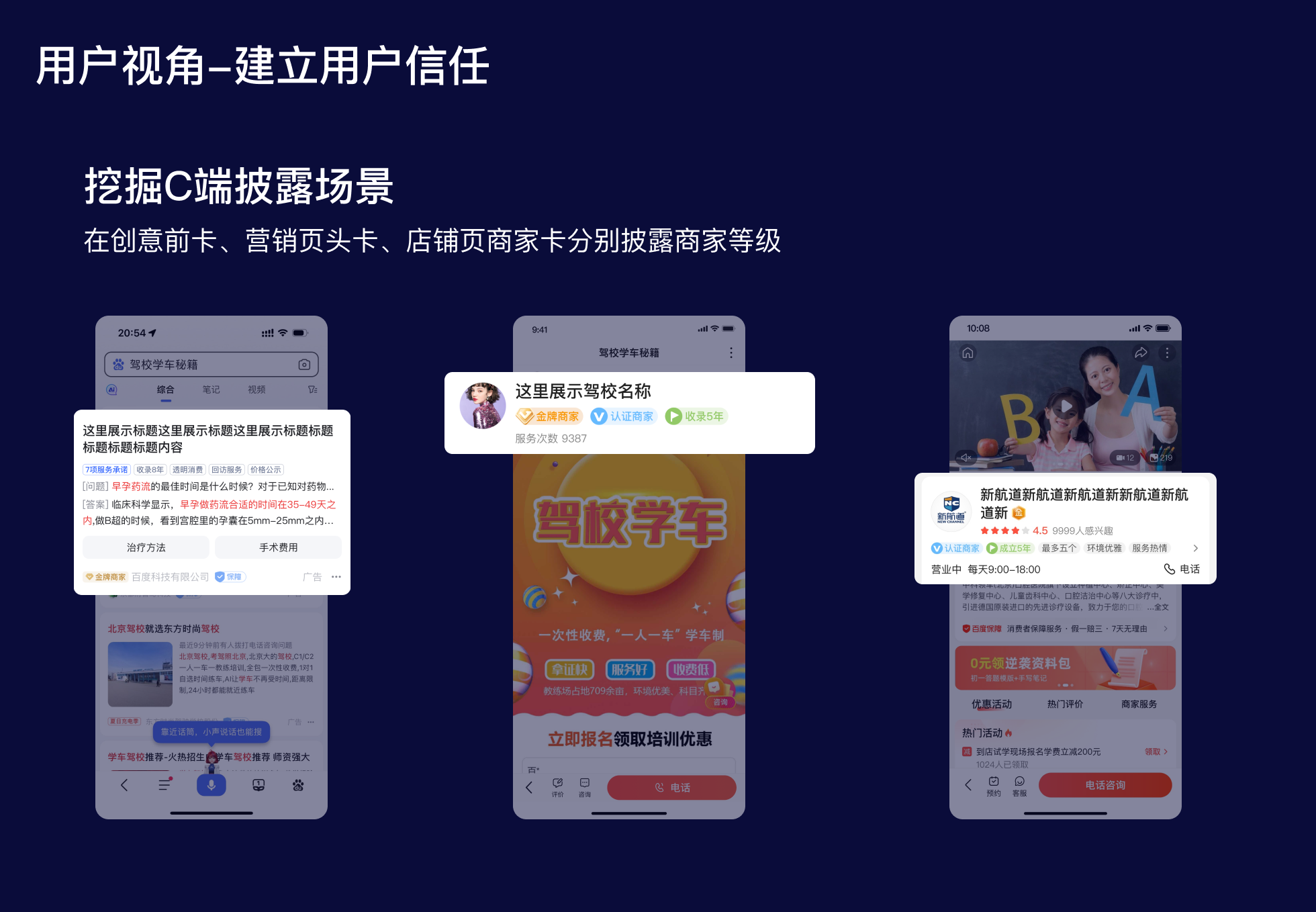 從用戶視角出發,商家等級項目的主要目標是建立用戶信任,所以設計師在強化徽標設計的同時,更需要挖掘用戶視角的披露場景,通過增加C端披露,幫助用戶了解該商家在百度生態內的等級情況,以輔助用戶決策。本項目中在C端共新增3個場景進行商家等級的披露,①搜索前卡;②營銷頁頭卡;③店鋪頁首卡。在3個重點場景披露商家的等級徽標,用戶在選擇商家時可以參考商家的等級,增強對商家的信任和認知。