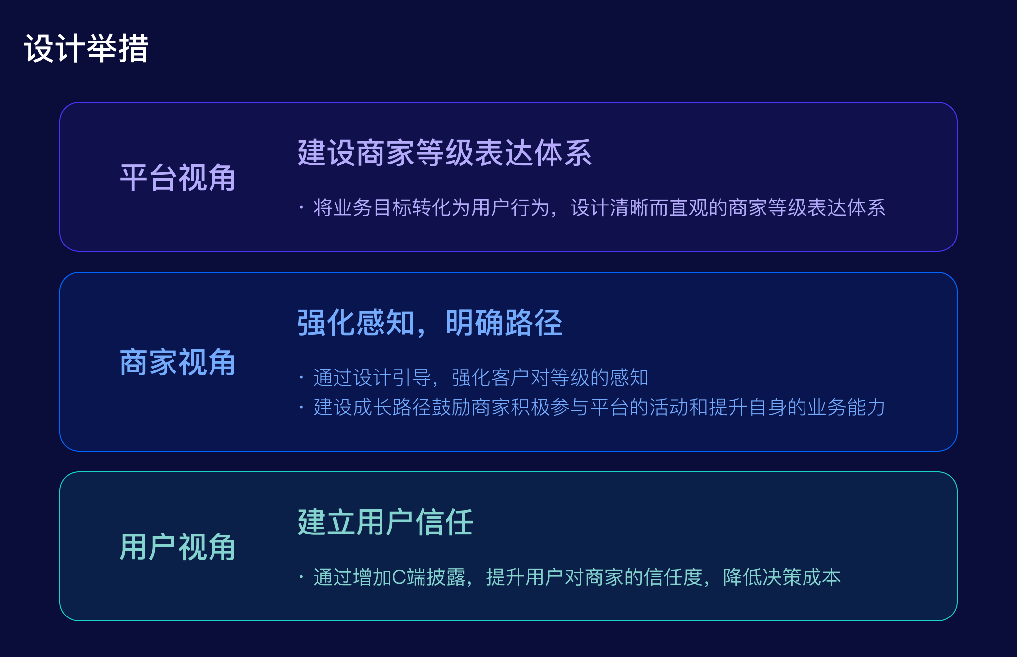 在設計之初,我們從不同的視角思考,對目標進行拆解和分析以獲得更全面、更多維的解決方案。從平臺視角分析,通過商家等級希望幫助商家快速定位服務短板,并提供有針對性的運營優化策略,從而提高商家質量和粘性;商家視角則希望通過商家等級獲得更多權益加持,從而提升轉化;C端用戶視角希望通過商家等級,幫助降低決策成本,建立更多信任。