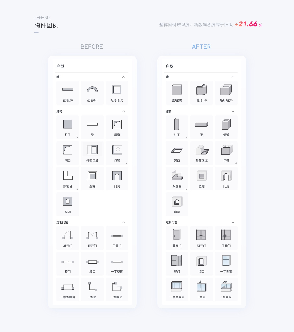 上線后通過問卷調研用戶滿意度相比舊版提升了21.66%,因此可以證明,更精準的圖形輔助用戶更高效的使用工具操作。以上是項目小組在試驗過程中的部分案例,不再一一列舉所有的試驗案例,可以看到信息表達的精準度、直觀度是能夠對業務產生直接的正向結果,鑒于群核下的工具產品有大量的應用圖標圖例,借此我們重新排查和校準了很多圖標,確保表達相對精準,提高用戶信息識別的精準度與效率。