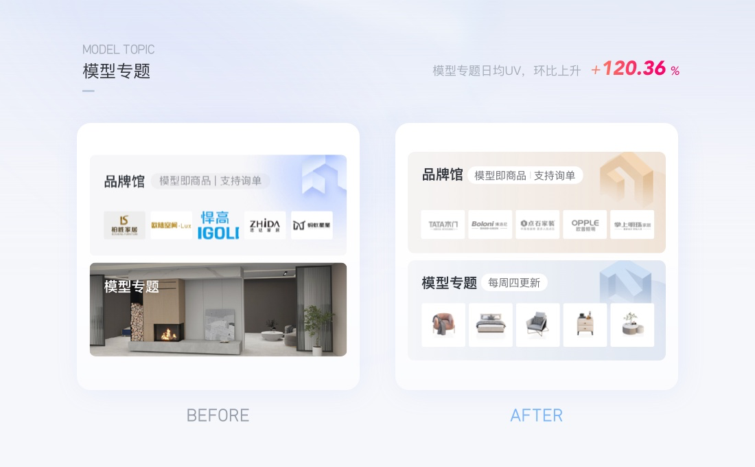 群核下的設計工具,以專題化的形式聚類商家、平臺推薦的模型是基本的運營動作,如下圖,原本以真實效果圖的方式展示模型專題,用戶難以感知是方案還是模型。通過封面圖形的優化:將核心的模型類型展示出來,用戶能夠預見里面的內容。