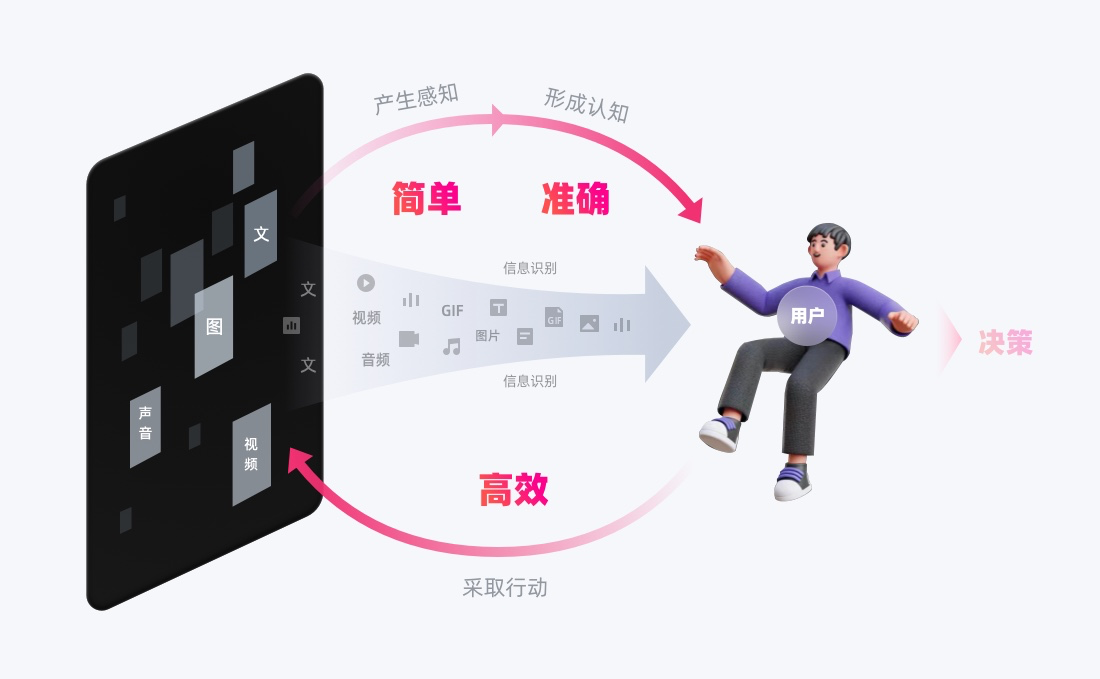 信息識別,可簡單理解為:感知到(看到/聽到)信息,并能夠理解它。本質是在用戶與界面交互中,會經歷「感知信息→認知信息→做出決策與行動」的歷程,從感知到認知,是信息獲取和辨識理解的過程,即「信息識別」。