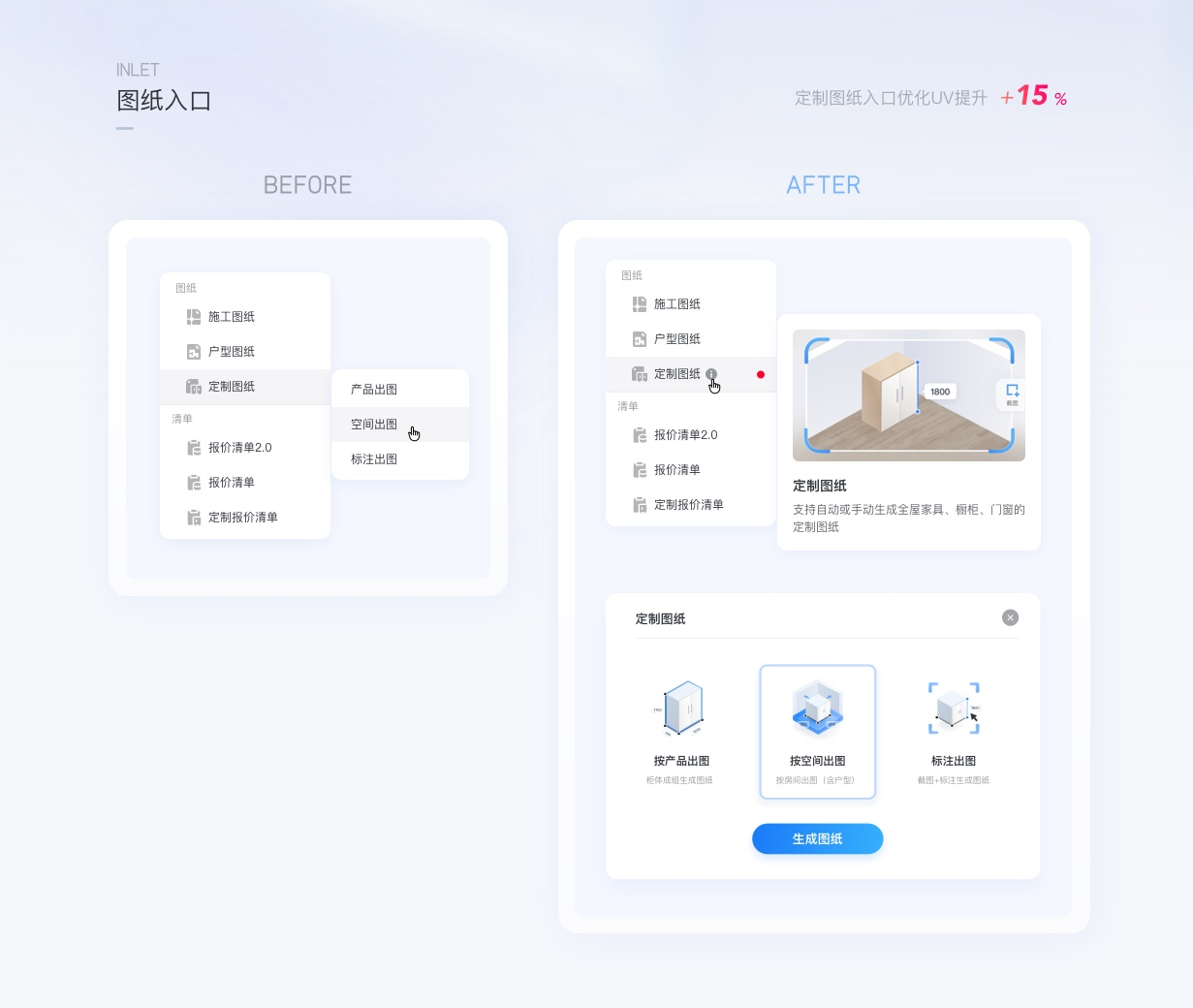 在新版優化中圖形化的表達了圖紙類型的差異,即便增加了流程步驟數,最終用戶點擊圖紙的UV提升了15%,此案例可以說明,更精準有效的對象表達能吸引更多用戶來使用此功能,對業務產生直接效果。