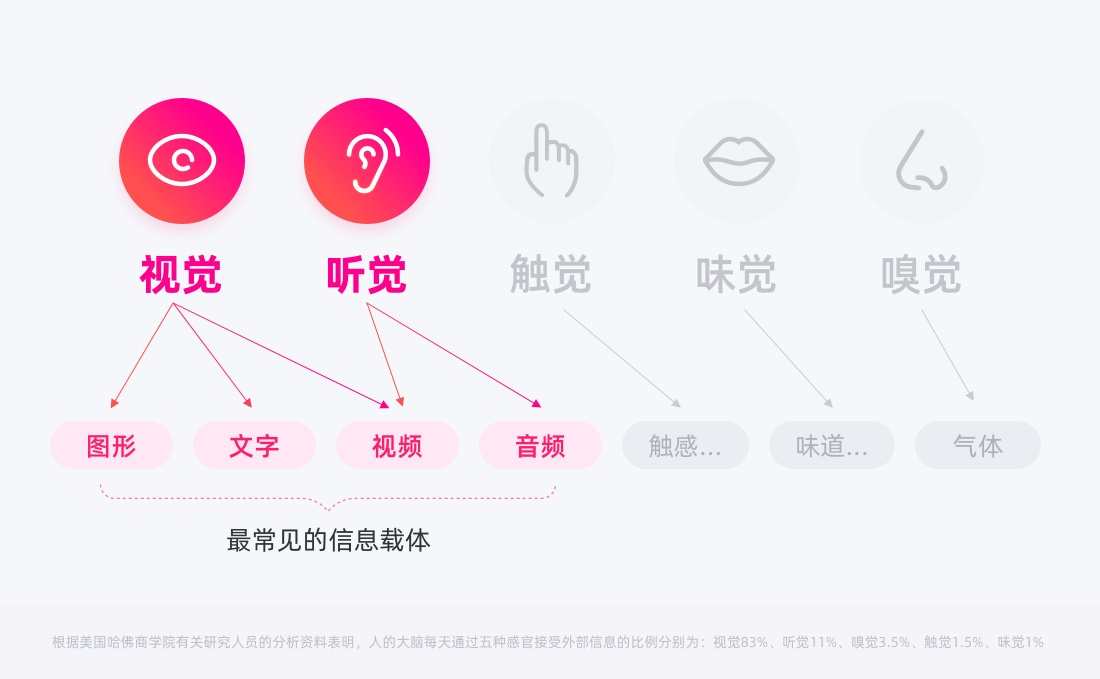在產(chǎn)品界面中信息交互過程中,信息最為常見的四種載體:圖形、文字、音頻、視頻(全景圖、gif圖、動效圖在大類暫時(shí)可算圖形,不作細(xì)分),而圖、文占據(jù)了絕對的比重,所以需要重點(diǎn)關(guān)注圖、文信息的識別體驗(yàn)。