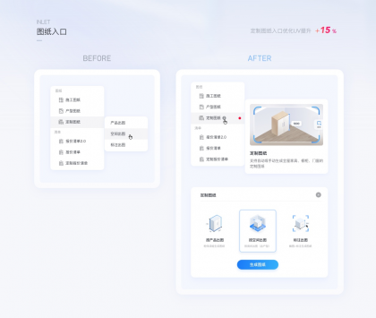 在新版優(yōu)化中圖形化的表達(dá)了圖紙類型的差異,即便增加了流程步驟數(shù),最終用戶點(diǎn)擊圖紙的UV提升了15%,此案例可以說明,更精準(zhǔn)有效的對象表達(dá)能吸引更多用戶來使用此功能,對業(yè)務(wù)產(chǎn)生直接效果。