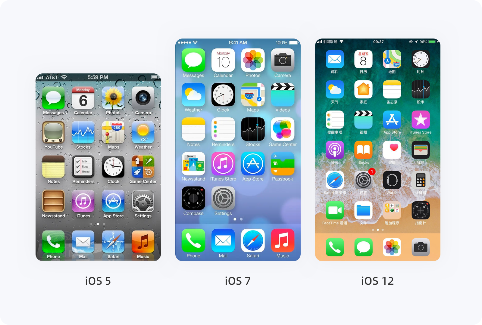 當2007年 iPhone Runs OS X(iOS 1 系統)出現時,應用界面和操作上跟現在的系統很像,里面也有了郵件、日歷、照片、時鐘、文本、Safari、便箋等應用。流暢的動畫、多點觸控的交互方式、簡潔的UI足以顛覆人們對于傳統意義上手機界面的認識。隨后,iOS 系統每次新版本的出現,都有一些變化,但與iOS 7 相比,就是小巫見大巫了。2013年,iOS 7 的發布,是迄今為止 iOS 系統史上設計風格的最大一次升級,UI設計由之前的擬物化轉向扁平化,整個系統外觀看起來十分簡潔,新增的指紋解鎖、控制中心設置快速切換、中國人喜愛的九宮格輸入法,以及簡化的圖標、交互的過渡動畫等,基本上每一各元素都在根據用戶的操作及行為習慣發生變化。毫不夸張的說,iOS 7 系統改變了近十年的設計風格,設計趨勢也正式從擬物化(復雜)時代走向扁平化(簡約)時代。iOS 12 在設計上雖然沒有太大變化,但系統的流暢度相對提升了很多,例如相機啟動速度提升70%、App啟動速度提升40%,新增勿擾模式、密碼自動填充等,包括后面 iOS 13 更加省電、面部解鎖速度提升、安裝包/更新包內層變小等,無一不是在將事情變的更簡單、更容易。