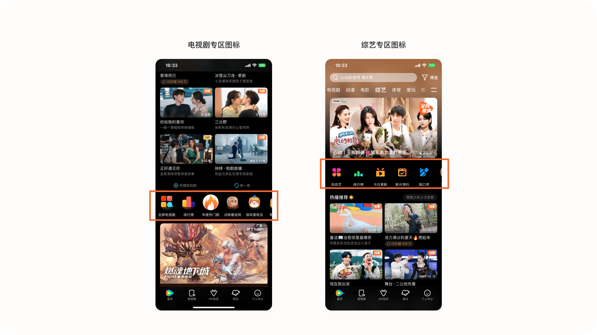 2.2.5設(shè)計誤區(qū):分區(qū)中的入口icon設(shè)計電視劇作為騰訊視頻的高頻點擊分區(qū),在頭部的icon確實有失大廠風(fēng)范,圖標(biāo)過大、視覺比例不一致、風(fēng)格不統(tǒng)一等問題,很影響界面的視覺美感,但入口的點擊轉(zhuǎn)化是否有影響未知。
