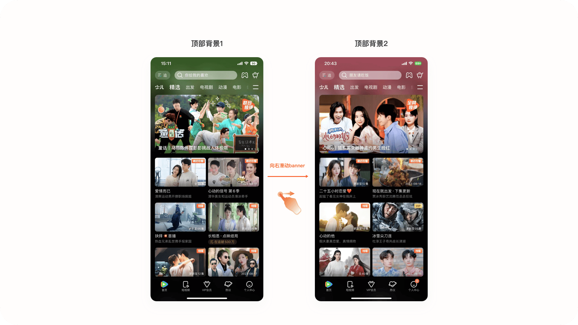 2.1.4設(shè)計亮點:頂部背景跟隨banner顏色進(jìn)行變化頂部背景跟隨banner進(jìn)行變化,當(dāng)用戶滑動banner時頂部背景會跟隨banner的顏色進(jìn)行變化,這樣可以讓界面的配色看起來更加和諧,提升界面視覺一致性。同時賦予用戶體驗驚喜感。