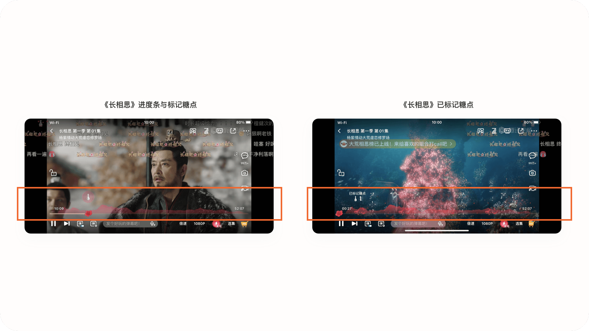3.2.1設(shè)計亮點:定制化進(jìn)度條與標(biāo)記糖點對應(yīng)熱門視頻內(nèi)容,騰訊視頻會定制化進(jìn)度條樣式與進(jìn)度點樣式,(如《長相思》中定制紅色木槿花)讓用戶更加沉浸的觀看體驗,同時在進(jìn)度條上方有標(biāo)記樣式,用戶點擊會觸發(fā)標(biāo)記動效與糖點,所有標(biāo)記的糖點數(shù)據(jù)也會以波動圖的形式顯示在進(jìn)度條上方,提高互動玩法。
