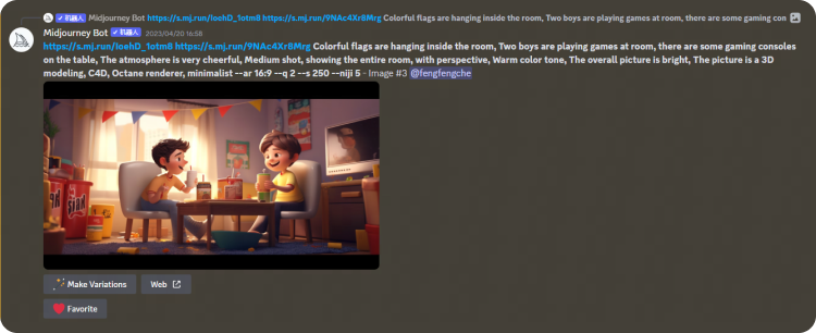 得到這張圖后,覺得畫面左上角部分有些空白,為了襯托歡快聚會的氛圍,我們決定在左上方加上掛旗。方法也是運用Midjourney的混音模式。在關鍵詞中加入“屋子里掛著彩旗”。