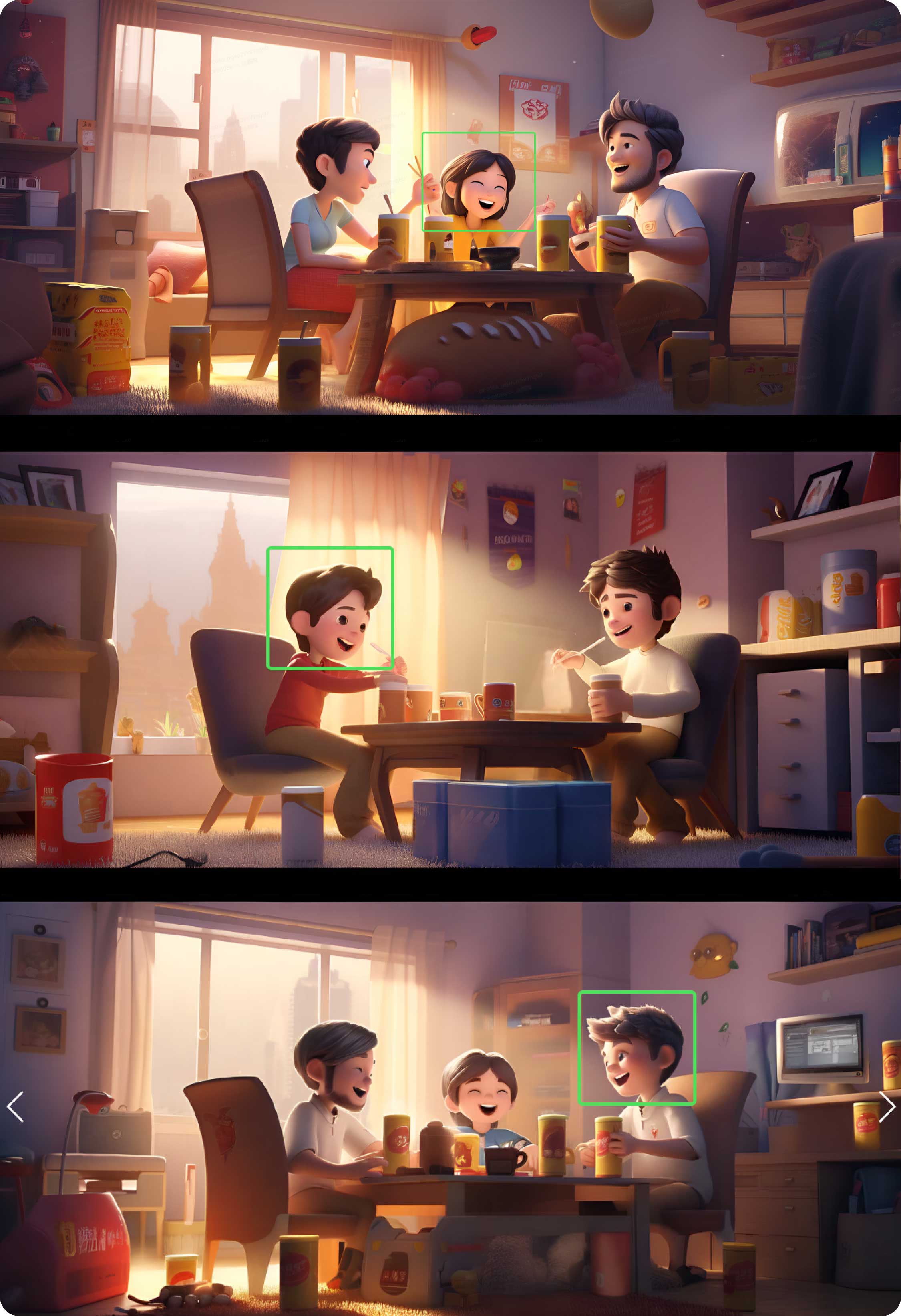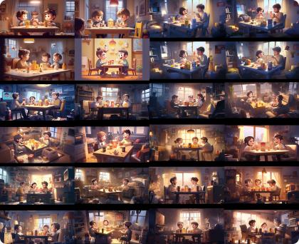 在前期,我們對構想的畫面進行關鍵詞的描述:“可愛帥氣的男女孩子們一起玩手機,開心地微笑著,舉起手歡呼,溫暖的房間,大型落地窗。”將關鍵詞翻譯后放入Midjourney中進行煉圖,最終篩選了幾張氛圍還不錯的進行下一步操作。