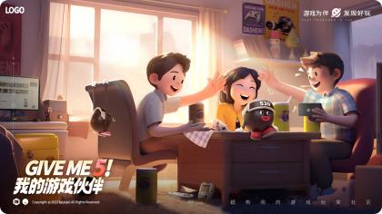 大概描繪了幾個伙伴在組隊玩游戲,因為獲得了勝利相互擊掌(give me 5)的輕松愉快的畫面。周圍有一些和游戲相關的元素,IP形象也在畫面中心露出,強調與品牌之間的關系。