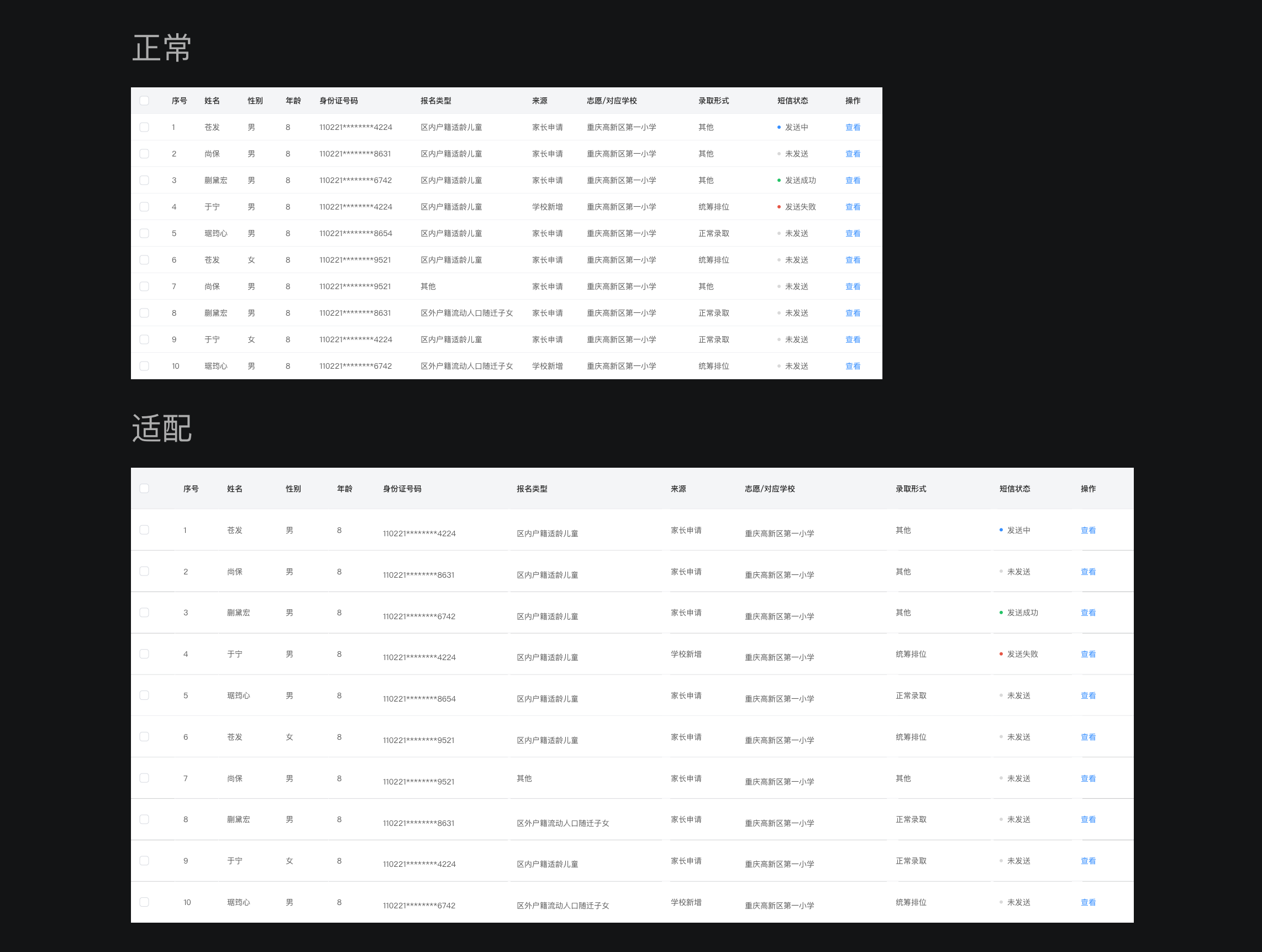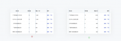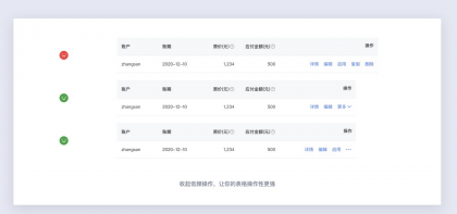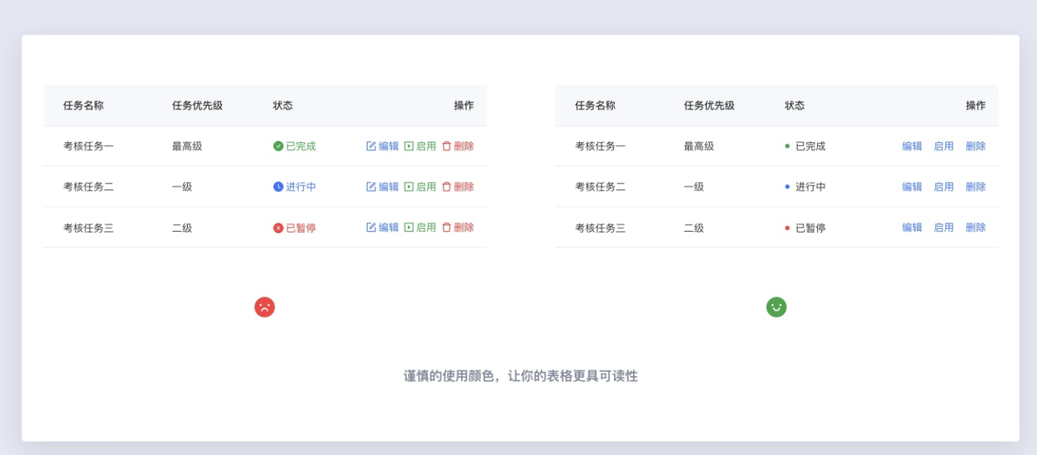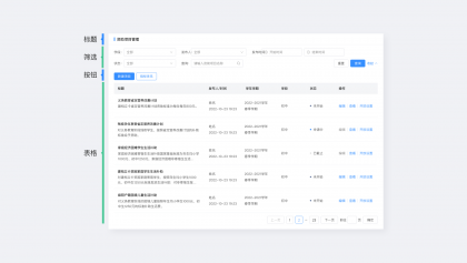 表格設(shè)計(jì)中一定不要使用過(guò)多的顏色區(qū)做狀態(tài)或操作的區(qū)分,過(guò)多的顏色細(xì)分會(huì)使表格變得更加混亂,影響用戶(hù)體驗(yàn)。對(duì)狀態(tài)的區(qū)分,僅用輕量的顏色區(qū)分即可,操作欄保持主色按鈕色。