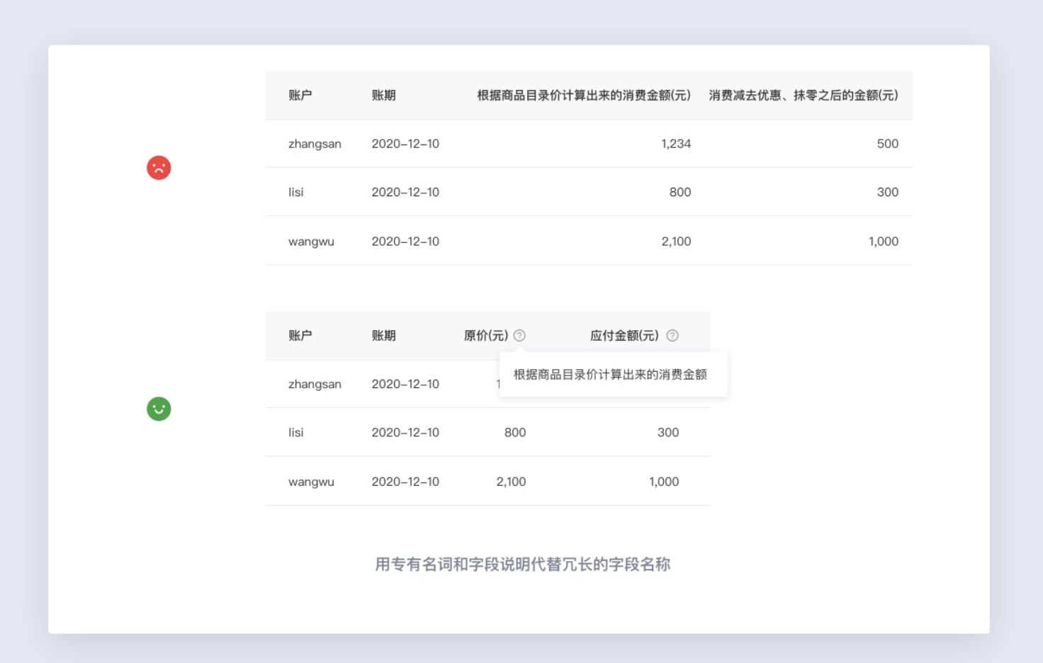 當(dāng)字段名稱(chēng)過(guò)長(zhǎng),又必須展示,才能有效的理解字段含義時(shí)。我們可以定義一個(gè)專(zhuān)有名詞代替,并且在字段名稱(chēng)后使用添加字段說(shuō)明的形式,來(lái)對(duì)字段加以說(shuō)明。這樣一來(lái)用戶(hù)既可以清晰的理解字段含義,又可以在有限的頁(yè)面空間下獲取到更多的數(shù)據(jù)信息。