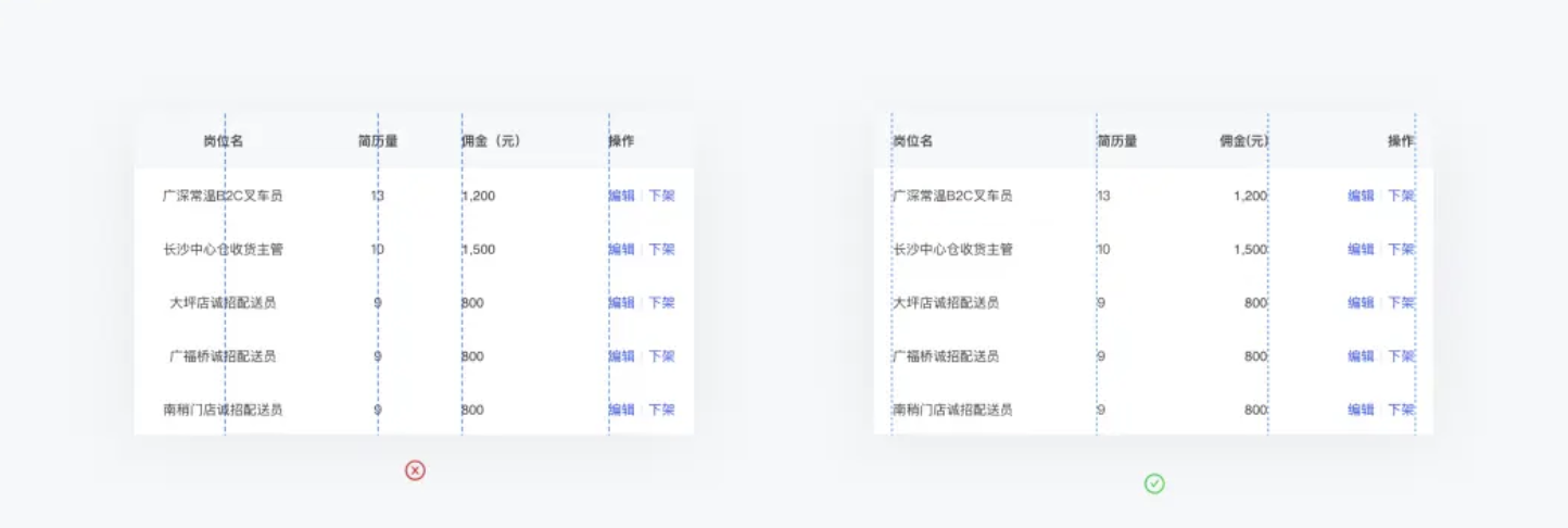 操作右對(duì)齊:操作即使沒(méi)有縱向分割線也能很好的起到分隔的作用,視覺(jué)上看表格是一個(gè)方方正正的格子,比較整齊