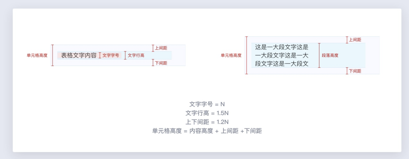 在開(kāi)發(fā)同學(xué)的眼中,單元格高度=內(nèi)容高度+上間距+下間距,在實(shí)現(xiàn)設(shè)計(jì)稿時(shí),通常也是按照這個(gè)方式來(lái)寫(xiě)的,而不是像設(shè)計(jì)同學(xué)一樣按照文字的尺寸來(lái)計(jì)算間距。其中,文字行高建議設(shè)為字號(hào)的1.5倍,上下間距設(shè)為字號(hào)的1.2倍。
