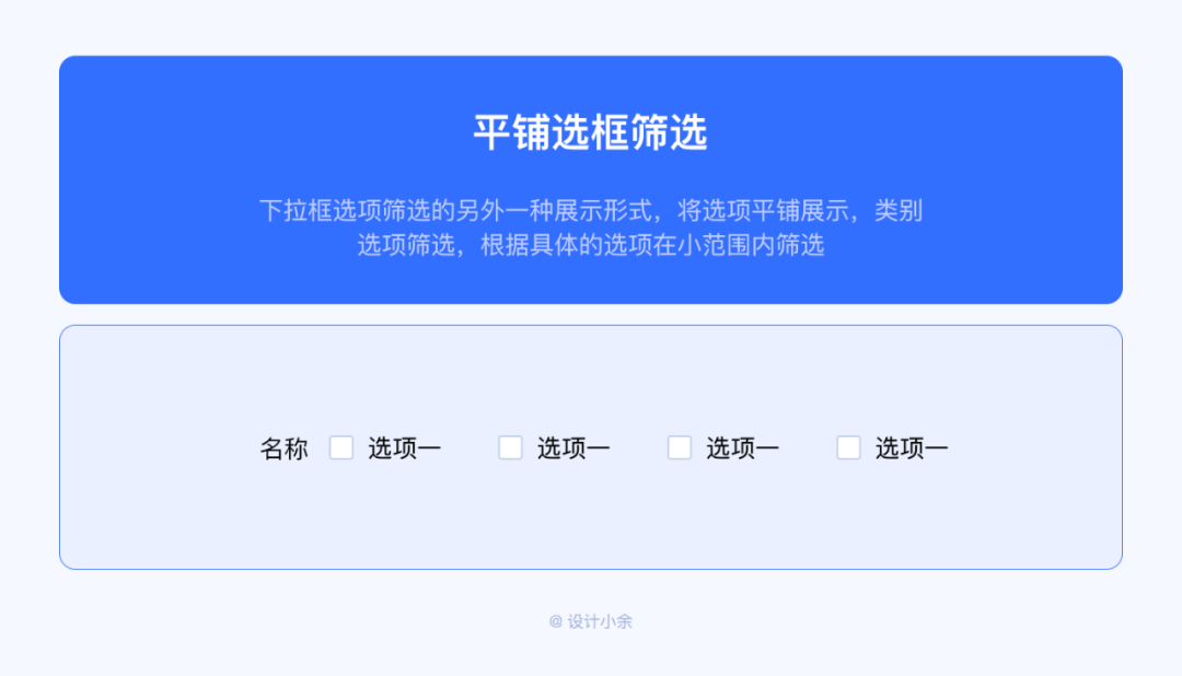 下拉框選項篩選的另外一種展示形式,將選項平鋪展示,類別選項篩選,根據(jù)具體的選項在小范圍內(nèi)篩選。