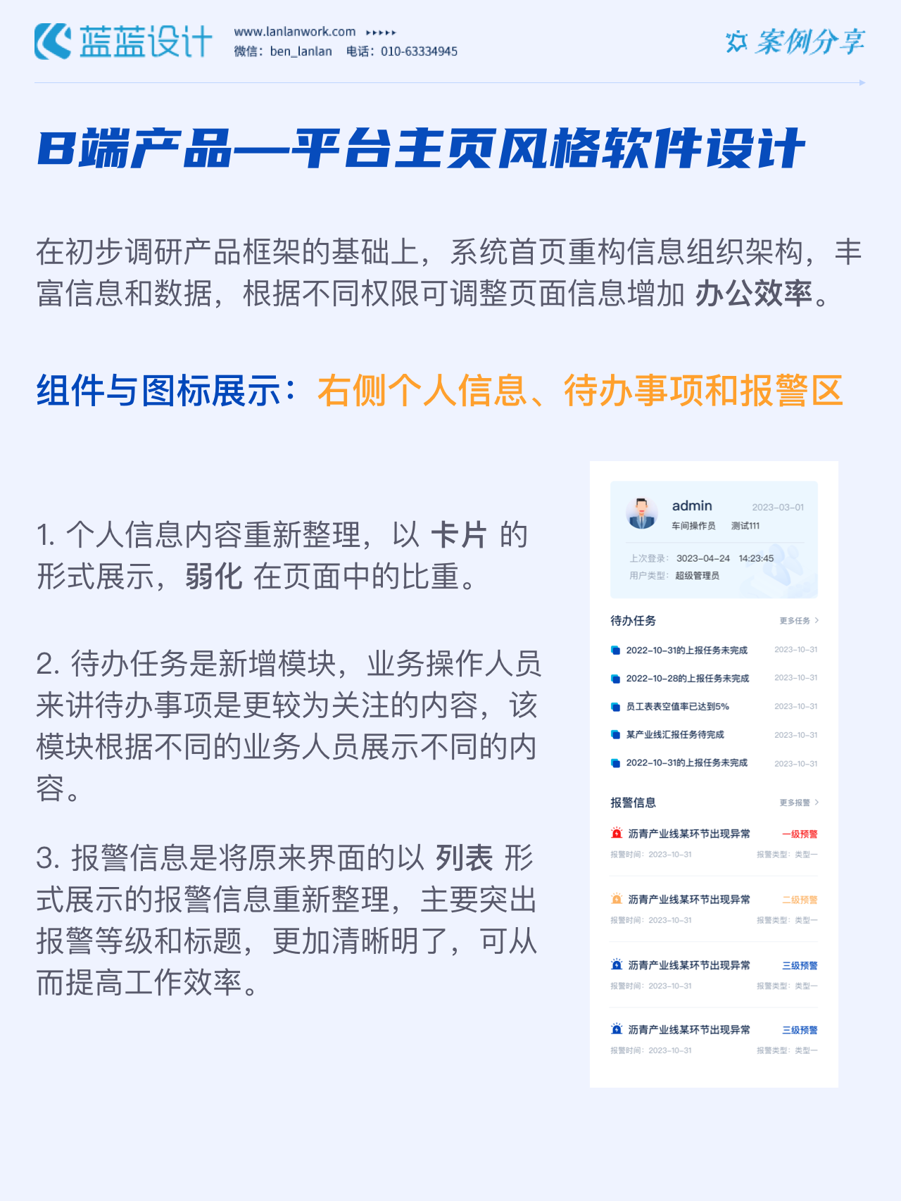 方案二:平臺主頁風(fēng)格 在初步調(diào)研產(chǎn)品框架的基礎(chǔ)上,系統(tǒng)首頁重構(gòu)信息組織架構(gòu),豐富信息和數(shù)據(jù),根據(jù)不同權(quán)限可調(diào)整頁面信息增加辦公效率。設(shè)計風(fēng)格采用簡約的設(shè)計語言,模塊化布局,方圓并構(gòu)的設(shè)計模式,界面強(qiáng)調(diào)可復(fù)用性和通用性,配色采用品牌色,品牌融合度高。