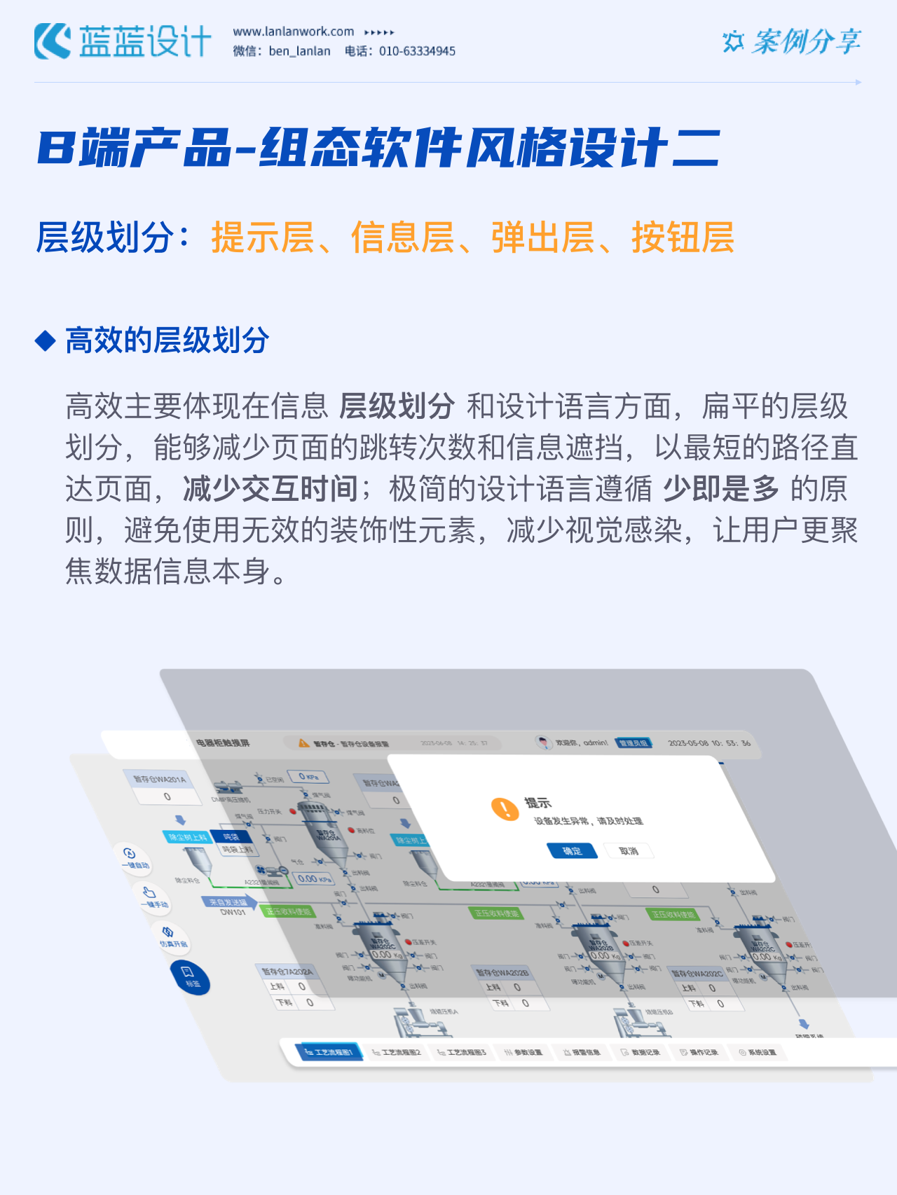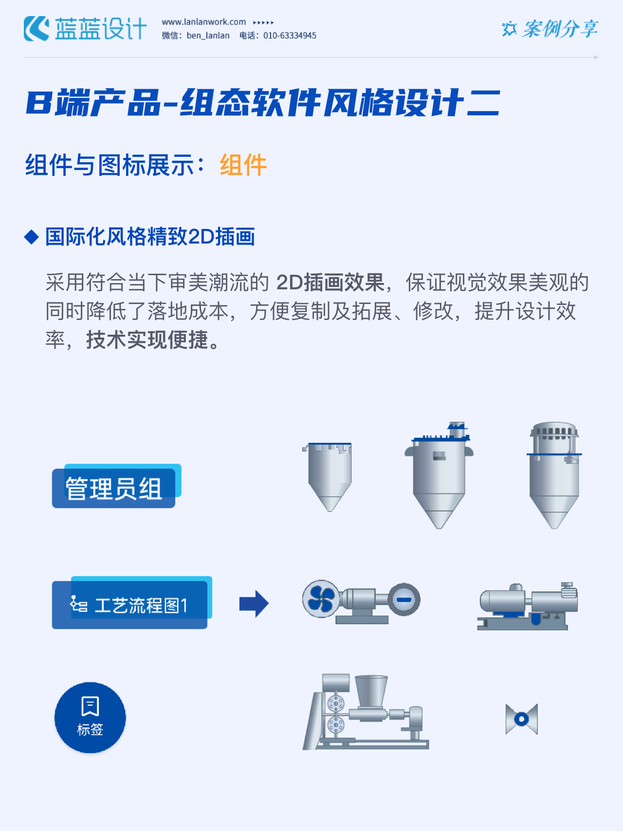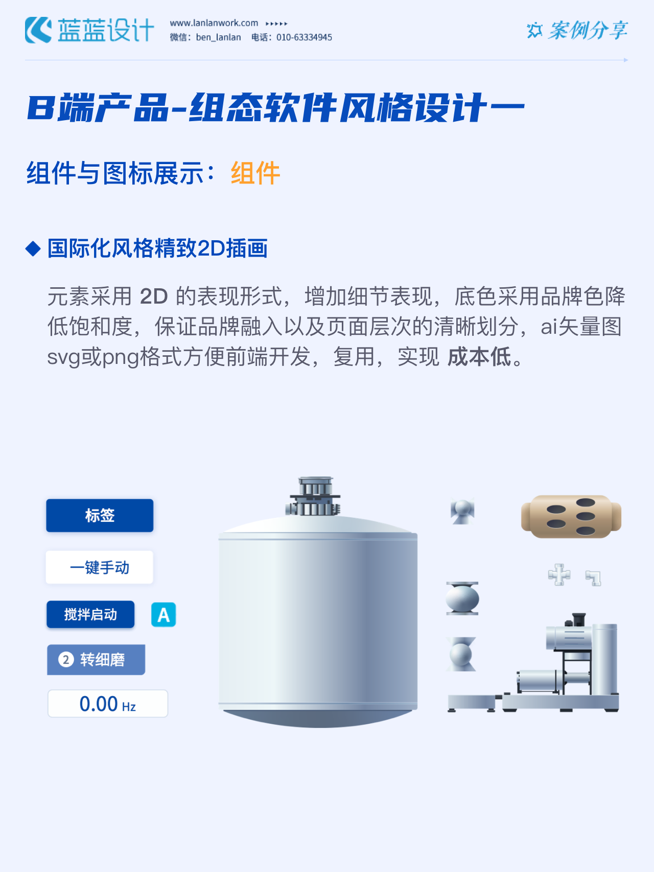 藍藍設計的兩種組態軟件風格都采用符合當下審美潮流的2D插畫效果,既保證了視覺效果美觀的同時也降低落地成本,方便后續的拓展、修改、提升與設計效率,同時注重用戶的閱讀習慣,將原功能點重新布局,主次內容對比明顯,降低視覺噪音,保證清晰順暢的操作,提升用戶體驗!