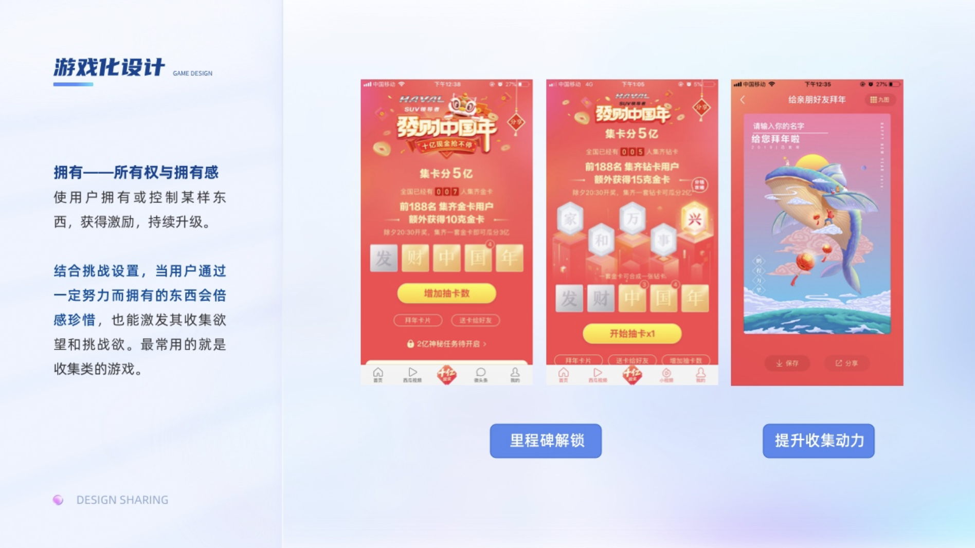 使用戶擁有或控制某樣東西,獲得激勵,持續升級。結合挑戰設置,當用戶通過一定努力而擁有的東西會倍感珍惜,也能激發其收集欲望和挑戰欲。最常用的就是收集類的游戲,比如各種收集類的活動中,先會獲得一個物品激發你對該系列的占有欲,不斷收集其他款。還有一種常用的是勛章的激勵,勛章本身是對行為的階段性的獎勵,好的策略和勛章樣式同樣能激發用戶的收集欲。