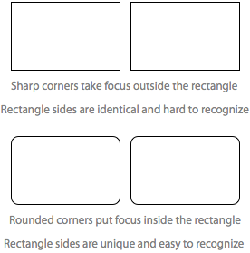 尖角指向外側,會降低矩形內部內容的視覺焦點。當兩個矩形相鄰時,尖角也使得難以區分矩形的兩邊。這是因為矩形的每條邊都是直線。圓角矩形的邊是獨一無二的,因為這些線條會向其所屬的矩形彎曲。