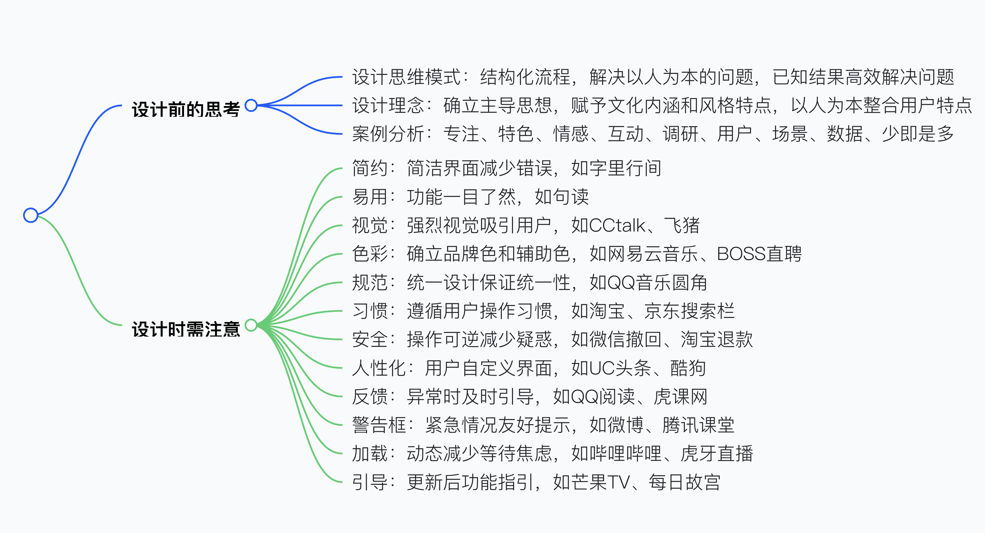 設計的最終目的是提高生活質量,設計前需思考設計思維模式(結構化解決以人為本的問題)、設計理念(以人為本確立主導思想),并進行案例分析(如百度網盤專注功能、每日故宮突出特色等 9 點);設計時要注意簡約(減少認知成本)、易用(功能一目了然)、視覺(抓住用戶眼球)等 12 點,涵蓋色彩、規范、習慣等方面,這些思考能提升設計效率與用戶體驗。