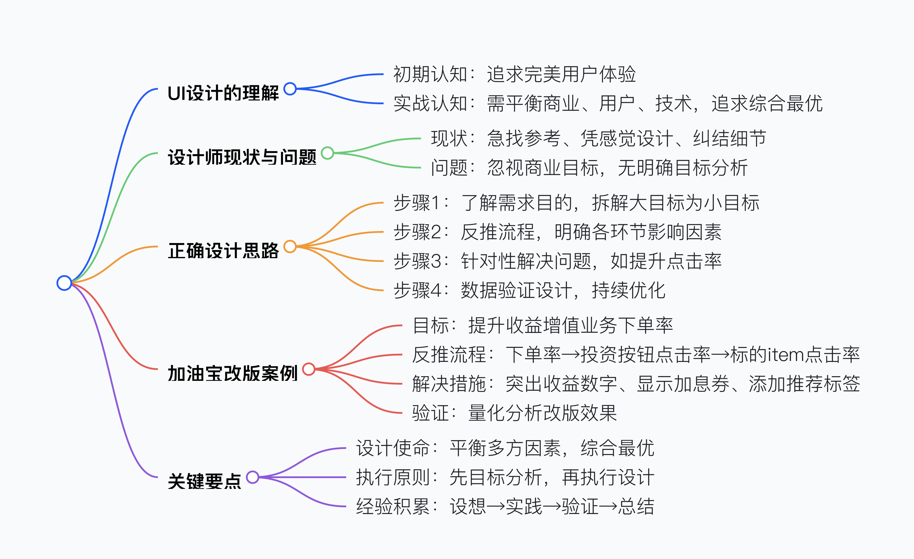 - 實戰(zhàn)認知:產品需背負商業(yè)價值(如養(yǎng)活公司員工、產業(yè)鏈人群),UI 設計應在商業(yè)「用戶」「技術」限制下求「綜合最優(yōu)」,而非「體驗最優(yōu)」。設計師需思考產品目標、業(yè)務價值及創(chuàng)造價值的方式。