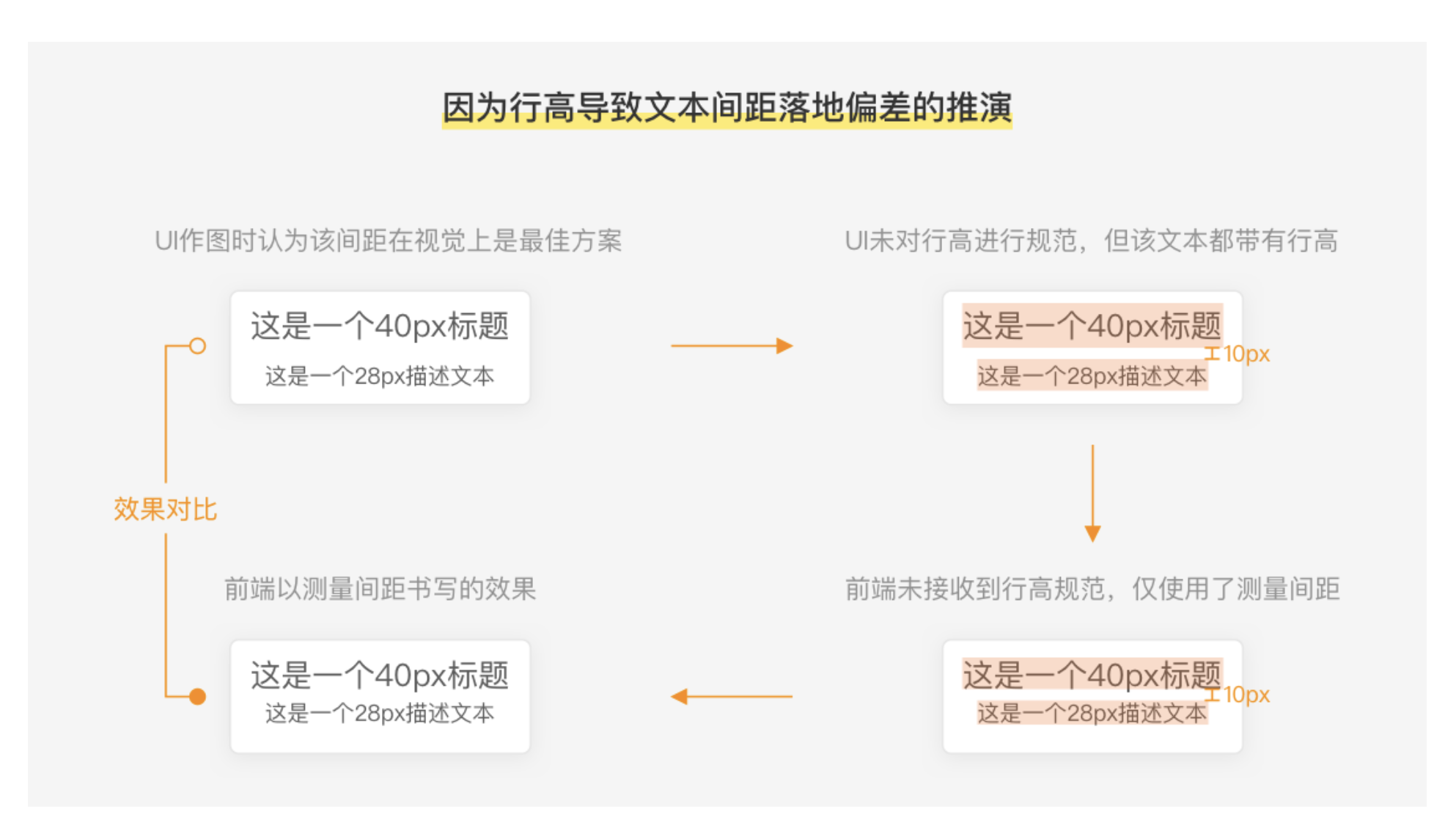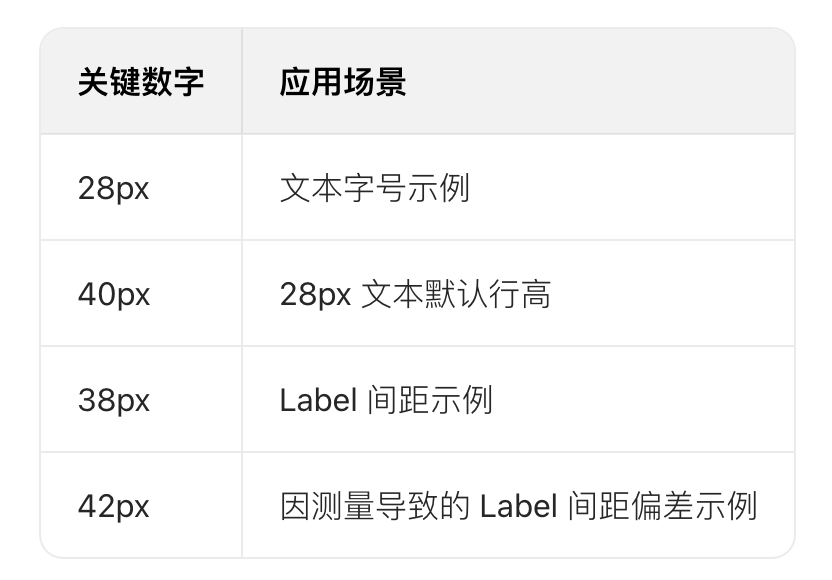 • 文本間距:文本行高可能導致前端測量誤差,如 28px 文本 Sketch 默認行高 40px,上下含空白像素,UI 需輸出規范行高(如 x 倍行高或具體值)與前端對接,避免因行高導致間距落地偏差。