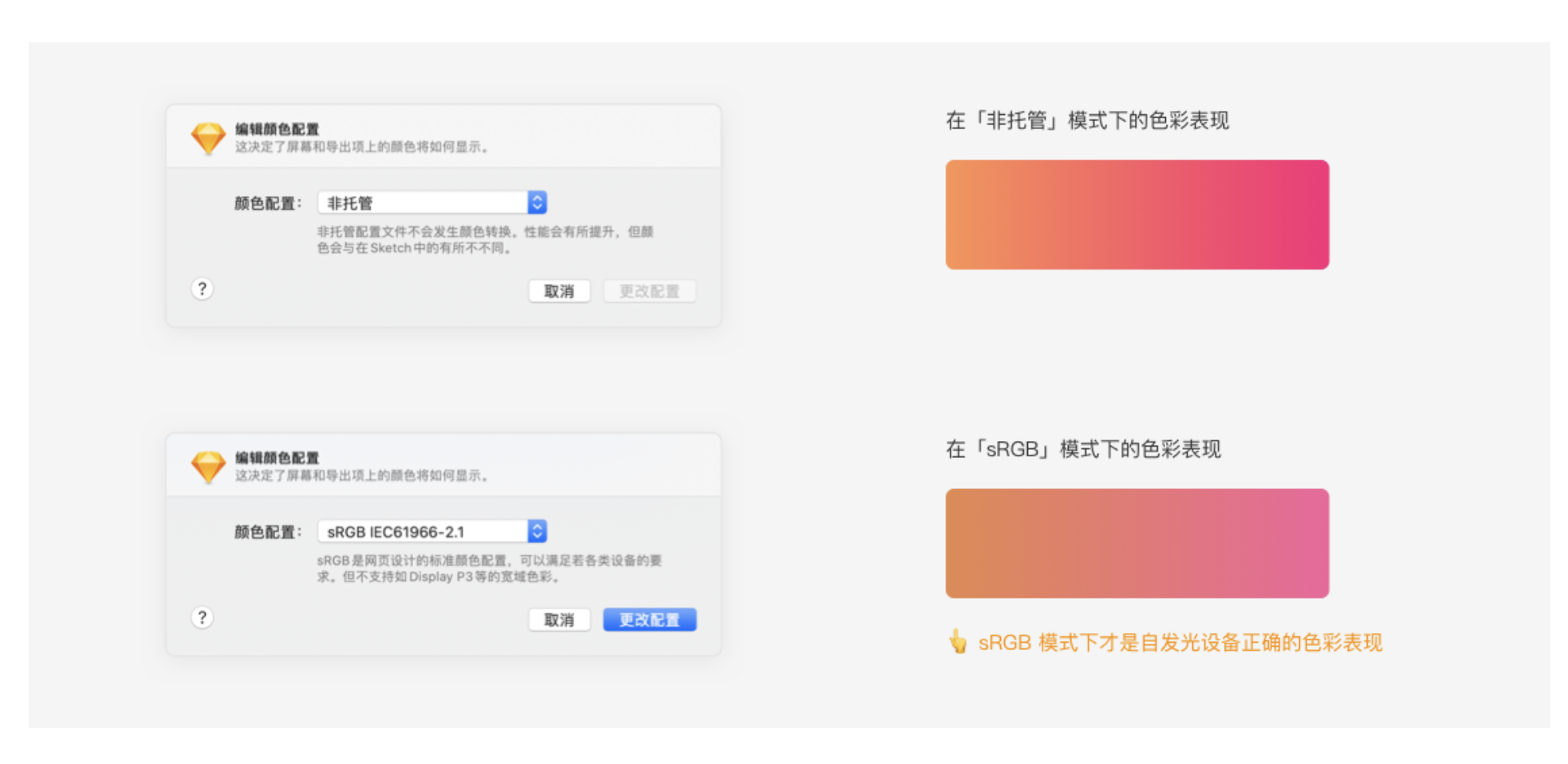 • 答案:Sketch 新建文件默認顏色模式為 “非托管”,此模式下色彩顯示比自發光設備艷麗明亮,若不改為 sRGB 模式,落地界面會比設計稿更暗更臟,所以 UI 需將 Sketch 顏色配置改為 sRGB 模式,保證落地界面與設計稿顏色一致。