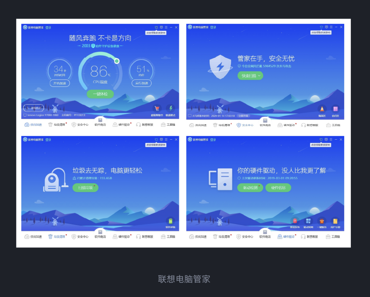 一致性設計能降低用戶學習成本、提升研發效率。布局一致性要保持統一結構,減少用戶對新結構的思考負擔。色彩一致性要求主色調統一傳遞品牌印象,功能性色彩形成固定規則。操作一致性是指同類功能操作邏輯統一,降低學習成本。反饋一致性要讓系統對同類操作的反饋方式統一,讓用戶與系統 “溝通順暢”。文字一致性要求文字大小、顏色、風格統一,避免用戶因 “格式混亂” 產生誤解。聲音一致性要使操作提示音固定,強化用戶對操作結果的預判。聯想電腦管家的優化加速、垃圾清理等模塊,在布局、文字、反饋方式上保持一致,既提升了用戶體驗,也降低了研發成本。