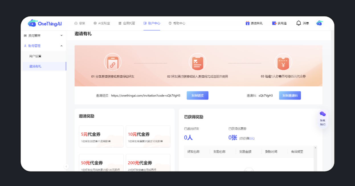 對于 SaaS 產品,在滿足業務場景的前提下,良好的體驗如同口碑的種子,會不斷生根發芽,讓更多人愿意付費并推薦給朋友,使產品像茁壯成長的樹一樣不斷吸引新養分。oneThingAI 推出的 “邀請有禮” 活動,會員推薦他人可獲得相應代金券,再加上工具本身體驗好、便捷易上手,在優惠活動期間,吸引了眾多 AI 愛好者注冊購買,有效促進了產品銷量增長。