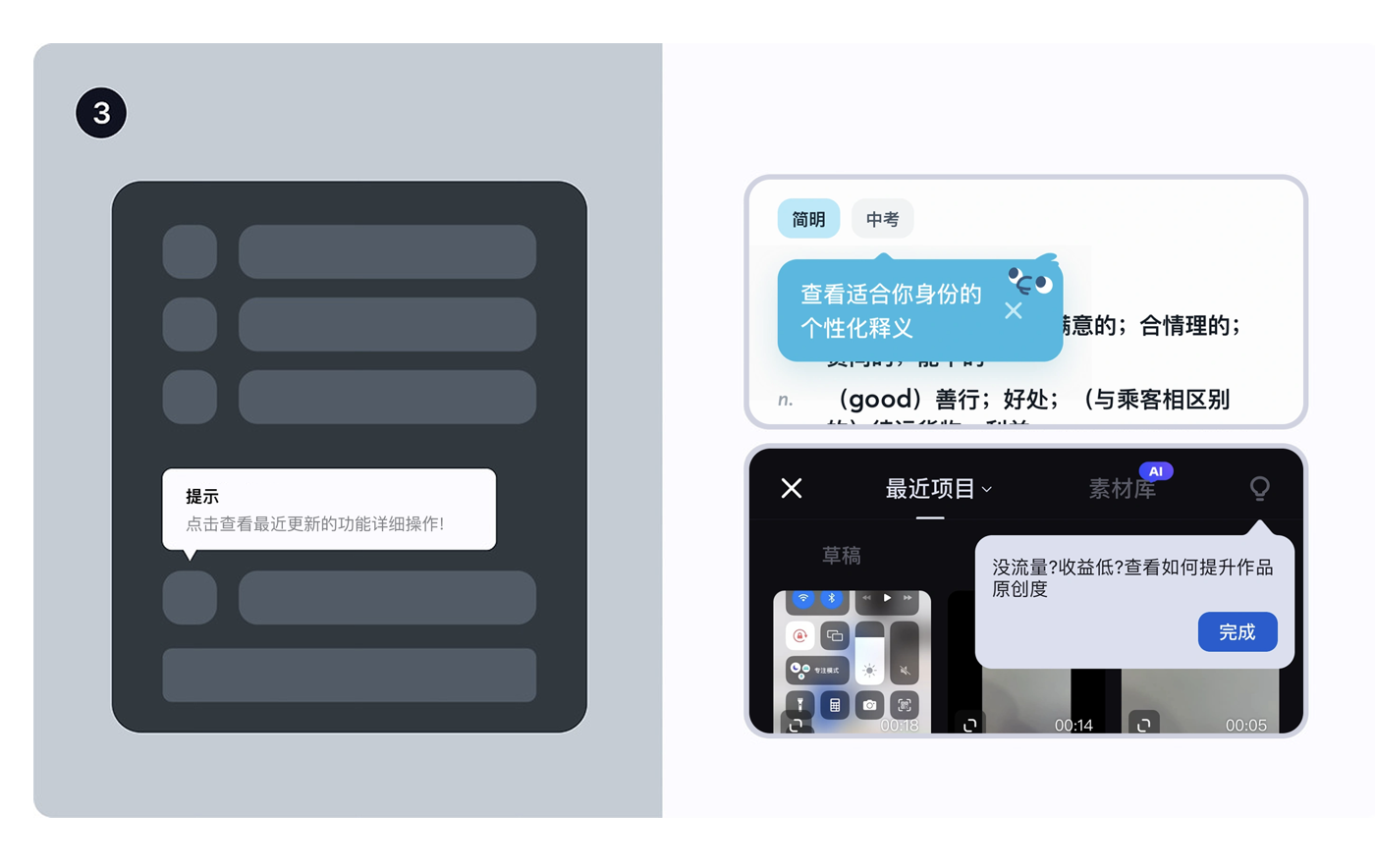 當產品更新復雜功能(比如 APP 新增 “待辦模塊”)時,用氣泡分步引導,結合用戶當前操作場景講解,比單獨的教程更自然。