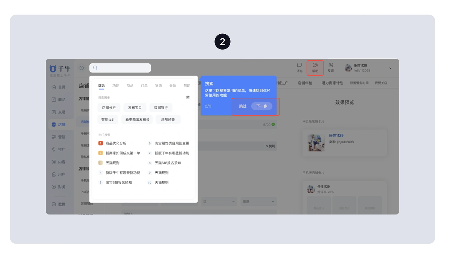 - 例子:千牛 APP 的新手引導會提示 “這里能搜索常用功能”,用戶可以點 “下一步” 繼續看,也能直接點 “跳過”;Notion 沒有強制引導,而是單獨做了 “幫助頁面”,用戶有問題再去查;