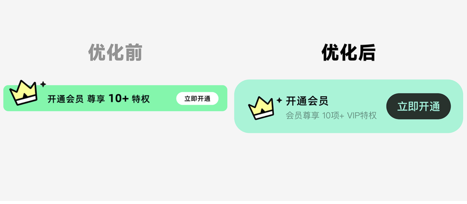 之前的 “開通會員” 入口,就一句話 “開通會員 尊享 10 + 特權” 加個小按鈕,平平無奇。優化時我們分了三步 “造層次”: