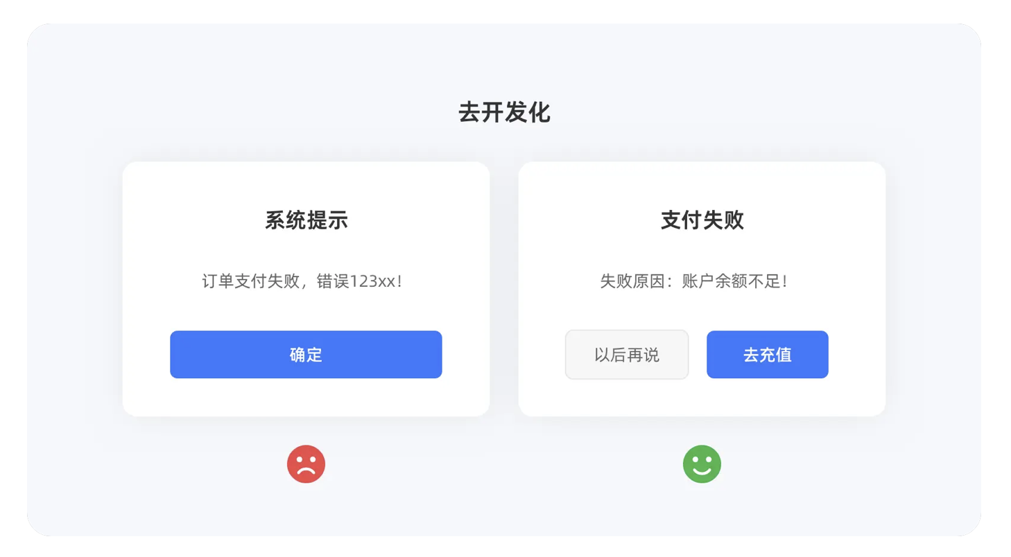 - 拒絕負面詞匯:避開 “不要”“不能”“失敗” 等詞匯,用正向表達替代,“暫未找到結果” 比 “沒有符合條件的內容” 更溫和。