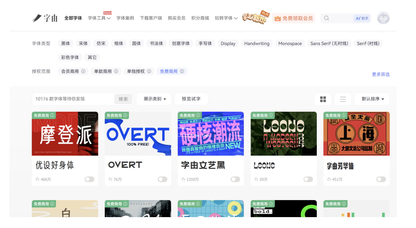 網站界面簡潔,字體分類清晰,每款字體都明確標注授權信息,可直接下載本地使用,也能關聯字由客戶端一鍵應用。更貼心的是,部分熱門字體支持在線開具授權證書,面對客戶的版權審核需求時能直接拿出證明,預算有限又追求設計質感的話,這里絕對值得深挖。