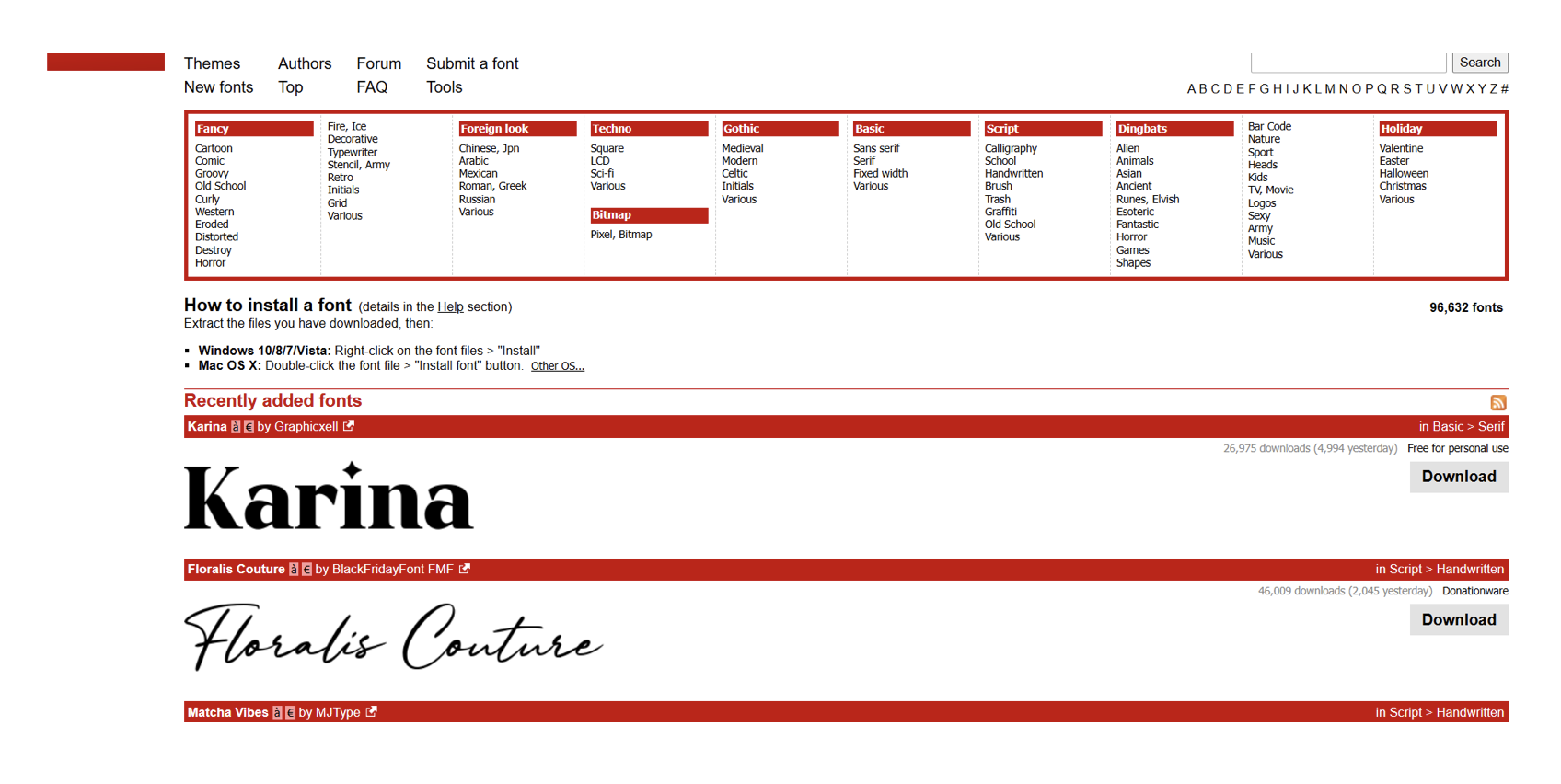 Dafont 是老牌免費字體網站,收錄超 4 萬款字體,風格從經典到怪異應有盡有,以英文字體為主,也不乏設計師自制的創意中文字體。它的分類系統格外細致,可按主題、風格、用途篩選,節日海報、游戲界面等特殊場景的字體需求,在這里都能找到驚喜。