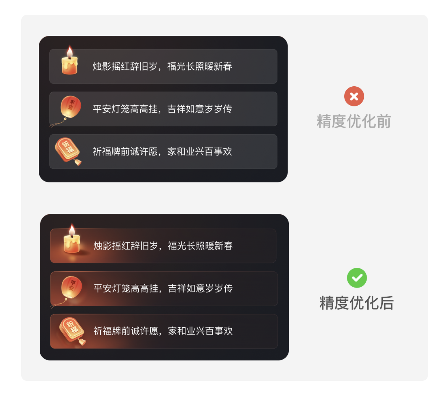 - 色彩呼應:讓容器、描邊、圖標保持同色系,避免色彩雜亂。比如新春祈福卡片,圍繞紅色主題展開,從容器漸變到圖標投影,都采用紅色系變化,強化主題氛圍。