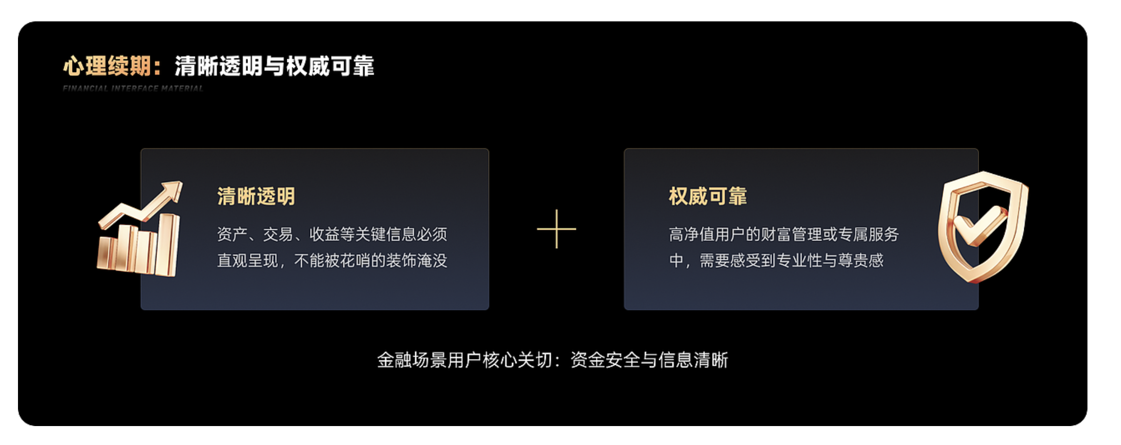 金融場(chǎng)景中,用戶的核心關(guān)切集中在兩點(diǎn):一是信息的清晰透明,二是服務(wù)的權(quán)威可靠。前者要求材質(zhì)不能遮擋關(guān)鍵信息,需通過通透、簡(jiǎn)潔的表現(xiàn)形式,讓資產(chǎn)、收益、交易記錄等內(nèi)容直觀呈現(xiàn);后者則需要材質(zhì)傳遞專業(yè)背書,尤其是高凈值用戶,對(duì)專屬感與尊貴感的需求,本質(zhì)上是對(duì) “專業(yè)能力” 的隱性確認(rèn)。因此,材質(zhì)設(shè)計(jì)必須在 “清晰傳遞” 與 “價(jià)值彰顯” 之間找到平衡。