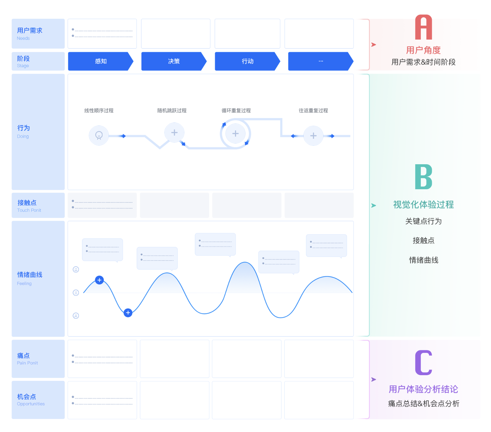 用戶體驗(yàn)地圖,是從真實(shí)用戶視角出發(fā),可視化呈現(xiàn)用戶完成某一核心任務(wù)的全流程體驗(yàn)工具。它梳理了用戶在任務(wù)中的每一個(gè)行為、與產(chǎn)品的接觸點(diǎn)、伴隨的情緒變化,精準(zhǔn)定位體驗(yàn)痛點(diǎn),最終提煉可落地的優(yōu)化機(jī)會(huì)點(diǎn)。