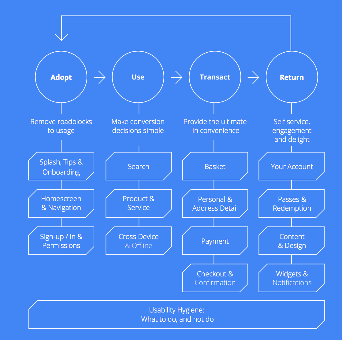 以下是應用設計時的四個步驟:適應、使用、交易、回流