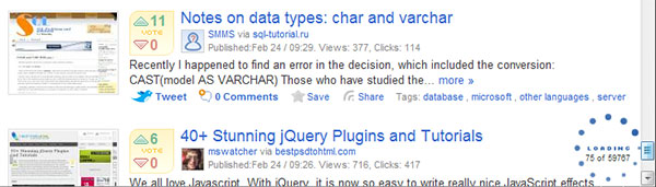 與分頁(yè)相反,連續(xù)滾動(dòng)是一種新型的數(shù)據(jù)顯示方式。這種方式不需要選擇特定的數(shù)據(jù)類型,新的數(shù)據(jù)被加到列表里。在加載的時(shí)候顯示進(jìn)度,如下例所示,在dzone.com里,進(jìn)度條顯示有多少項(xiàng)已經(jīng)被加載。