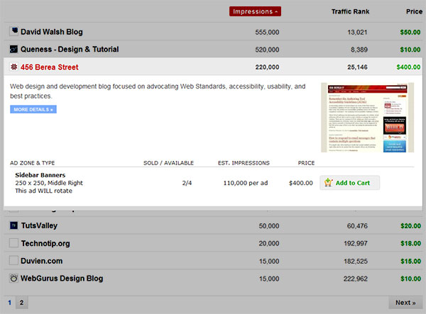 關(guān)于這種模式我寫過(guò)一篇文章,也建了一個(gè)可以輕松實(shí)現(xiàn)的jQuery小插件。 這種模式的關(guān)鍵點(diǎn)就是可以給表格增加更多相關(guān)信息功能。以BuySellAds為例,展開(kāi)行顯示了出版商的廣告詳細(xì)信息,同時(shí)始終顯示主行里的重要信息。