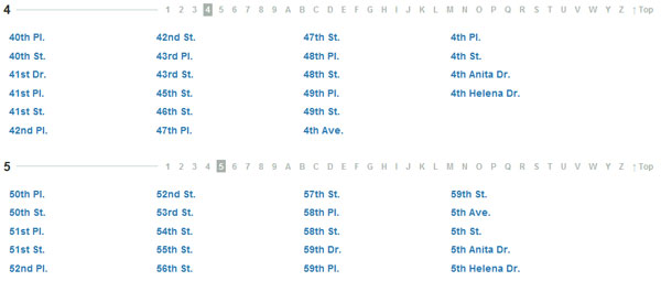 Product Planner 采用了標(biāo)準(zhǔn)的分頁(yè)顯示,有頁(yè)碼數(shù)字,有上一頁(yè)下一頁(yè)。但是,你能告訴我第2頁(yè)是什么? 第3頁(yè)?當(dāng)然你不能。不用擔(dān)心,標(biāo)準(zhǔn)分頁(yè)可以得到改善。如下所示,通訊錄很龐大,他們使用了數(shù)字和字母來(lái)分頁(yè)。在這個(gè)例子里顯示所有的頁(yè)和隱藏頁(yè)一樣好。你可以以此類推應(yīng)用到其他條件相似的表格。如果表格以日期來(lái)分類,你可以以日期范圍來(lái)替代傳統(tǒng)的分頁(yè)數(shù)字(如第1頁(yè)可以寫成2.10-2.12,等等)