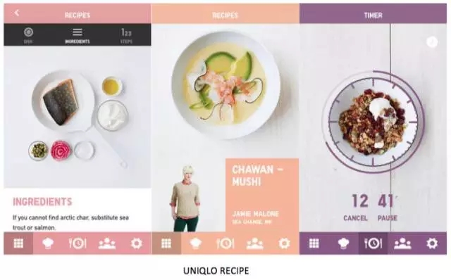 優(yōu)衣庫出品的RECIPE,是一個讓人眼前一亮的設(shè)計案例,多彩色的設(shè)計風(fēng)格融入到整個APP中,不論是切換標簽頁,還是在內(nèi)容組塊中滾動,都會變更不同的主題色。色彩切換的時候,還會有淡入淡出的效果,讓切換變得自然而然,完全不生硬。
