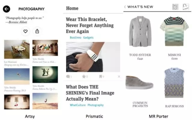 Artsy的圖片瀑布流,完全沒有用到線和面來區(qū)分信息組塊,而就是用內(nèi)容本身做排版,用戶可以更加集中注意力于圖片內(nèi)容上。Prismatic利用字體排版,盡可能的內(nèi)容前置,弱化圖標和操作,讓用戶更集中注意力于內(nèi)容閱讀上。而MR Porter則利用商品圖片、名稱和價格直接做設(shè)計,讓用戶聚焦于商品本身。