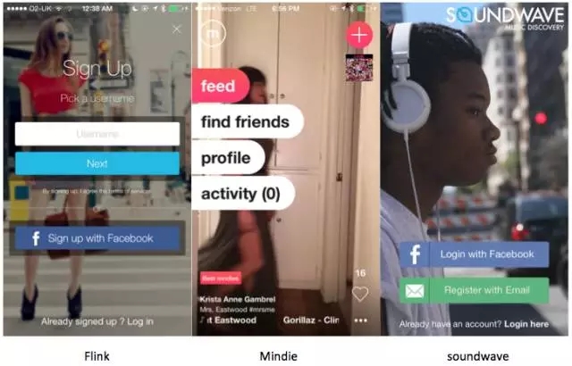 大視野背景圖風(fēng)格也分為兩種,一種像Secret、The Whole Pantry這樣的,內(nèi)容區(qū)塊中采用大視野背景圖,好處是可以利用圖片做區(qū)塊分割,難度是圖片拼接后的效果不一定好看,所以可能還需要配合描邊、留白等設(shè)計手段優(yōu)化拼接。另外一種就是想Vsco、Flink、Mindie、Soundwave這樣的,全屏背景圖甚至打通狀態(tài)欄,前景做內(nèi)容排版、導(dǎo)航、操作。好處是設(shè)計非常具有生命了,所有有朋友把這種風(fēng)格也叫有計劃設(shè)計,說的就是回歸大自然的設(shè)計手法。但風(fēng)險也是很明顯的,就是前景的信息排布設(shè)計其實是有很大挑戰(zhàn)的,必經(jīng)花花綠綠的背景太過于干擾注意力,導(dǎo)致前景的文字內(nèi)容可讀性會變?nèi)酢K孕枰阎匾僮饔妹鞔_的按鈕區(qū)隔出來,閱讀型文字跟背景圖要用明顯的反色,還是不行的話就把文字浮在半透明蒙層上,解決可讀性問題。